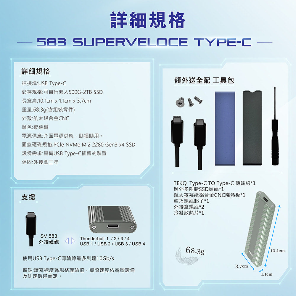 ■ 時尚輕巧,攜帶方便■ 支援PCI-E M.2 NVME 2280固態硬碟■ Type-C 接口,10Gbps傳輸速度■ 使用JMS583高階晶片,支援加速、延長SSD的各式指令■ 多重散熱設計,加強對流散熱■ 附贈組裝工具■ 附贈Type-C to Type-C傳輸線■ 一年保固